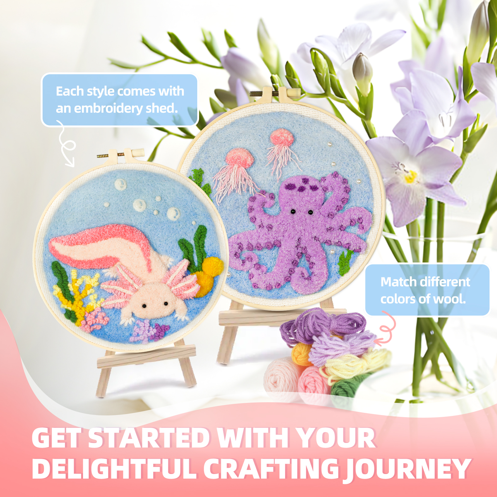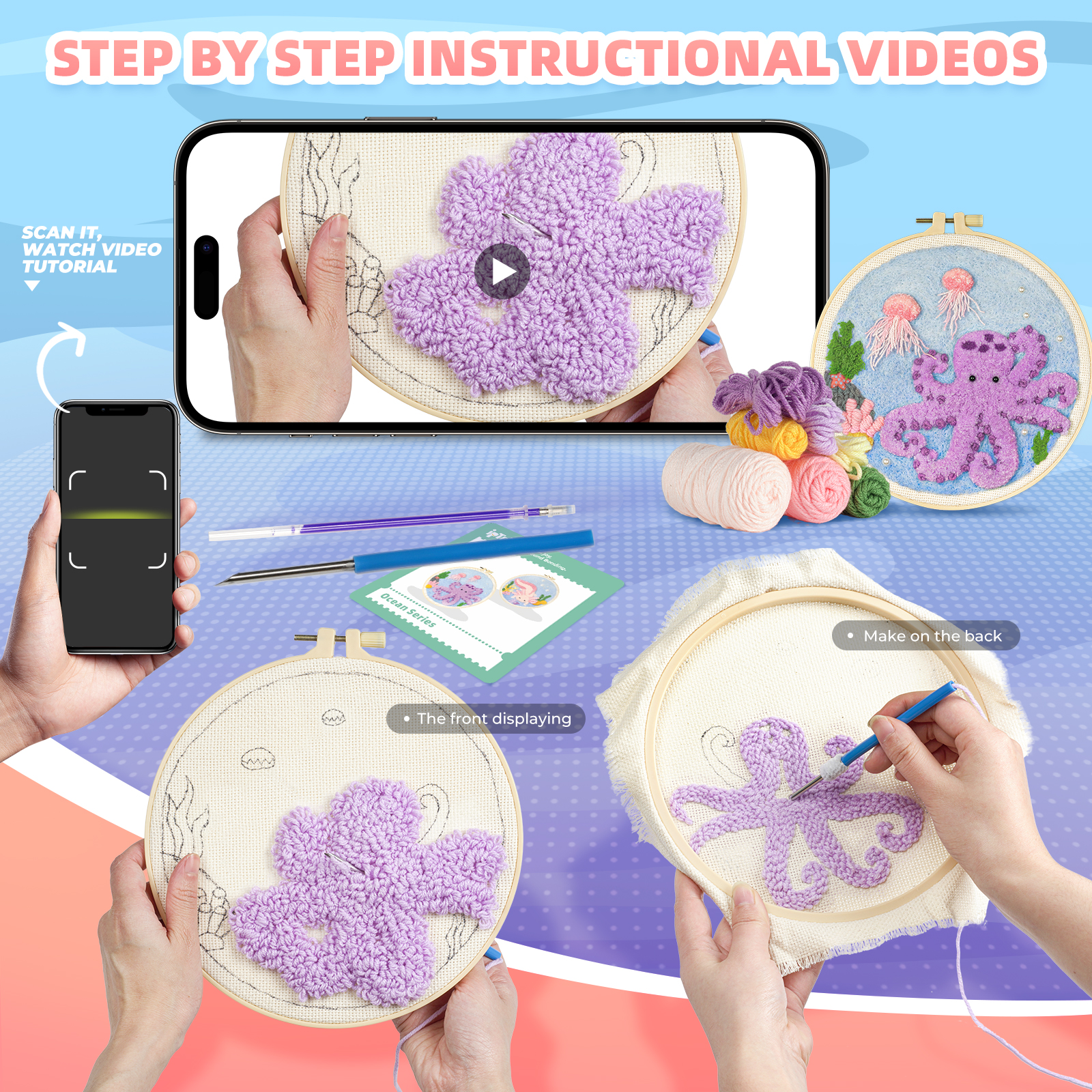 🛍️ All-Inclusive Kit – Comes with high-quality embroidery cloth, colorful yarn, a punch needle tool, a threader, an embroidery hoop, and both instruction booklets & video tutorials—ready to use right out of the box!