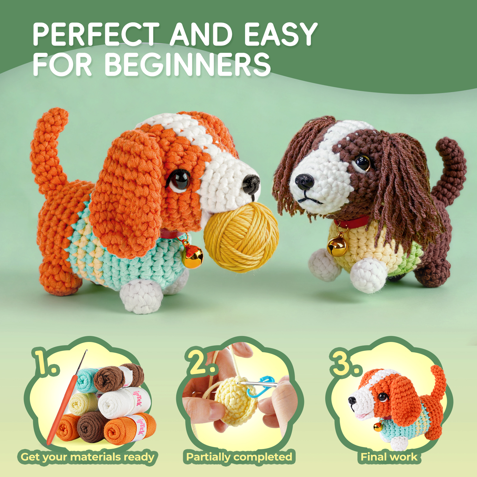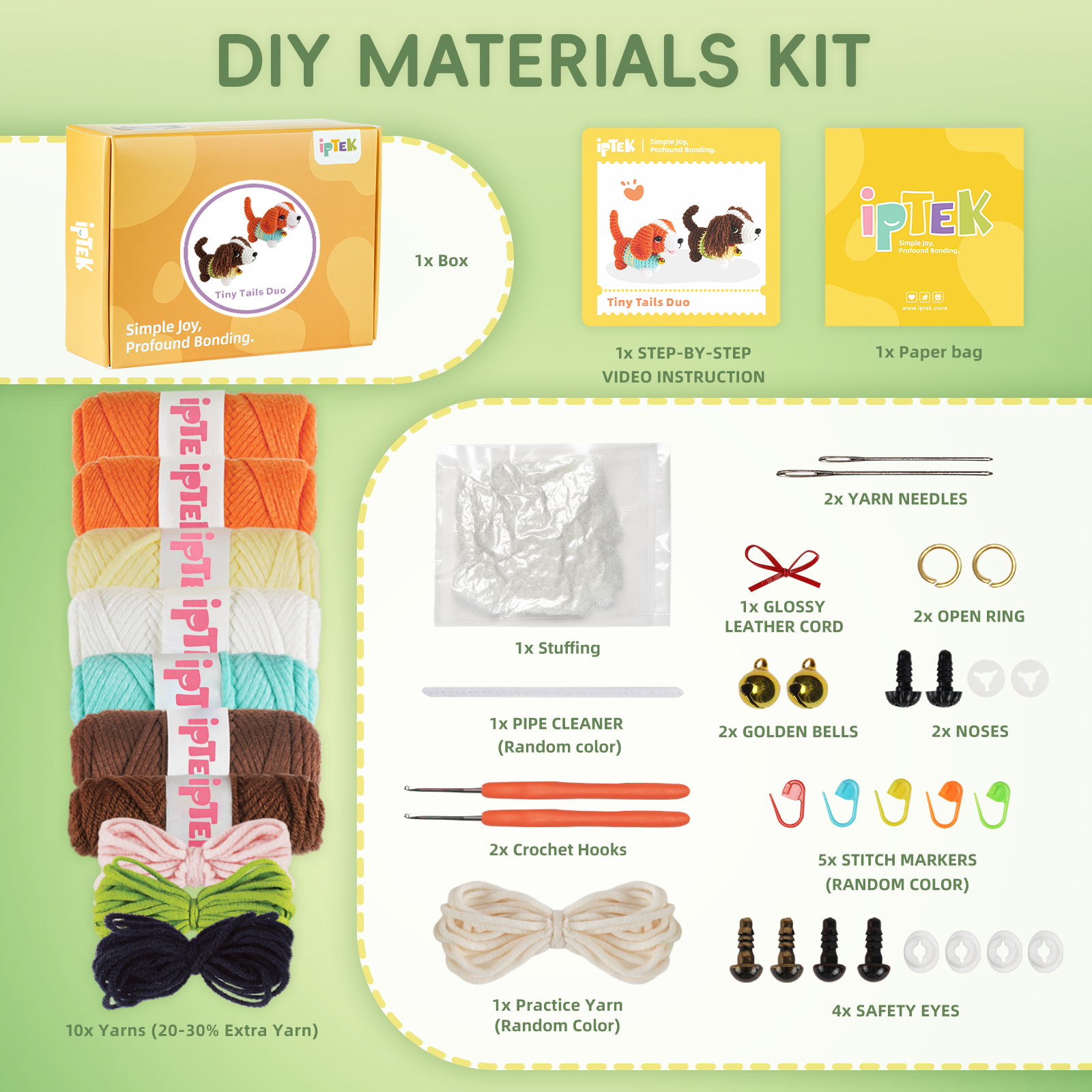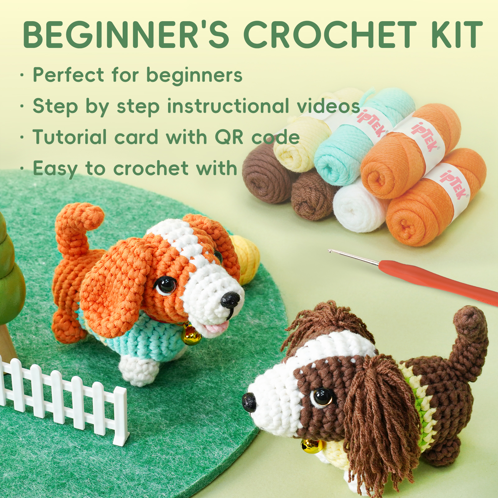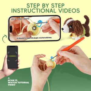 Includes everything you need: an ergonomic crochet hook, soft beginner-friendly yarn, stitch markers, safety eyes, a blunt needle, stuffing, plus detailed PDF and video tutorials—no extra supplies needed!